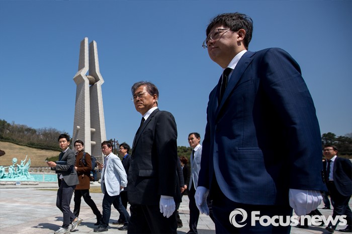 (광주=포커스뉴스) 문재인 더불어민주당 전 대표와 김홍걸 국민통합위원장이 8일 오전 전남 광주 5.18 민주묘지를 방문 하고 있다.