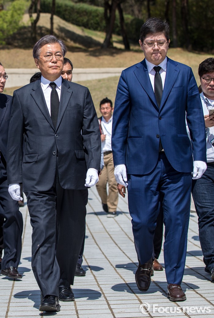 (광주=포커스뉴스) 문재인 더불어민주당 전 대표와 김홍걸 국민통합위원장이 8일 오전 전남 광주 5.18 민주묘지를 찾아 민주열사 묘지를 둘러 보고 있다.