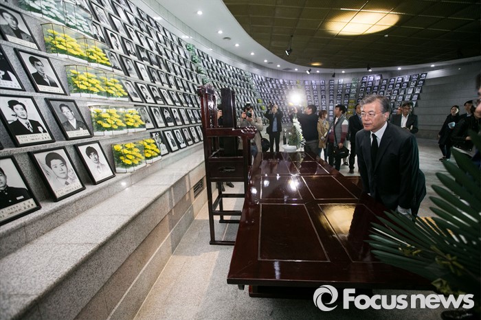 (광주=포커스뉴스) 20대 총선이 5일 남은 8일 오전 더불어민주당 문재인 전 대표가김홍걸 국민통합위원장과 함께 광주 북구 국립5.18민주묘지 내 유영봉안소를 방문해 참배 후 영정을 살펴보고 있다.