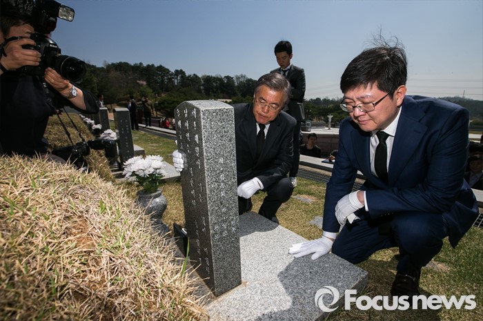 (광주=포커스뉴스) 문재인 더불어민주당 전 대표(가운데)가김홍걸 국민통합위원장과 함께 8일 오전 광주 5.18민주묘지를 방문해 열사들의 묘소를 참배하고 있다.