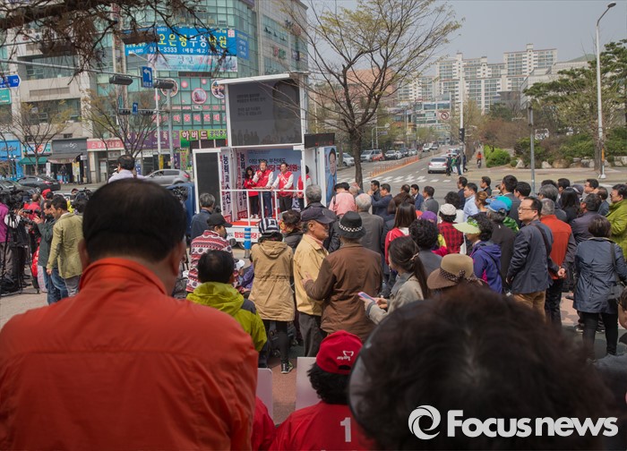 (부천=포커스뉴스) 8일 오후 경기 부천시 역곡역 인근에서 이사철 새누리당 부천원미을 후보 지원유세에 나선 김무성 대표가 유권자들의 지지를 호소하고 있다.