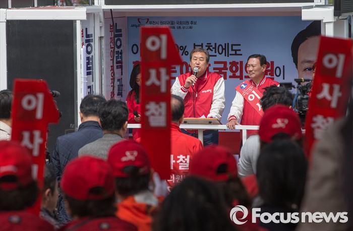 (부천=포커스뉴스) 8일 오후 경기 부천시 역곡역 인근에서 이사철 새누리당 부천원미을 후보 지원유세에 나선 김무성 대표가 유권자들의 지지를 호소하고 있다.
