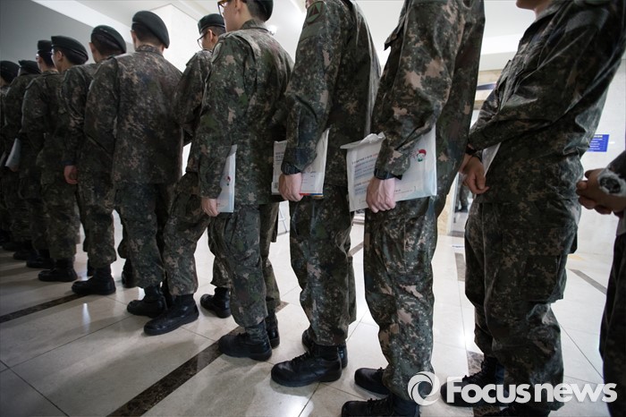 (서울=포커스뉴스) 4.13총선 사전투표 첫째날인 8일 오후 서울 서초구 방배4동 주민센터에 설치된 사전투표소에서 수방사 장병들이 투표를 하기위해 기다리고 있다.