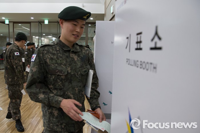 (서울=포커스뉴스) 4.13총선 사전투표 첫째날인 8일 오후 서울 서초구 방배4동 주민센터에 설치된 사전투표소에서 수방사 장병들이 투표를 하고 있다.