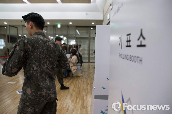 (서울=포커스뉴스) 4.13총선 사전투표 첫째날인 8일 오후 서울 서초구 방배4동 주민센터에 설치된 사전투표소에서 수방사 장병들이 투표를 하고 있다.