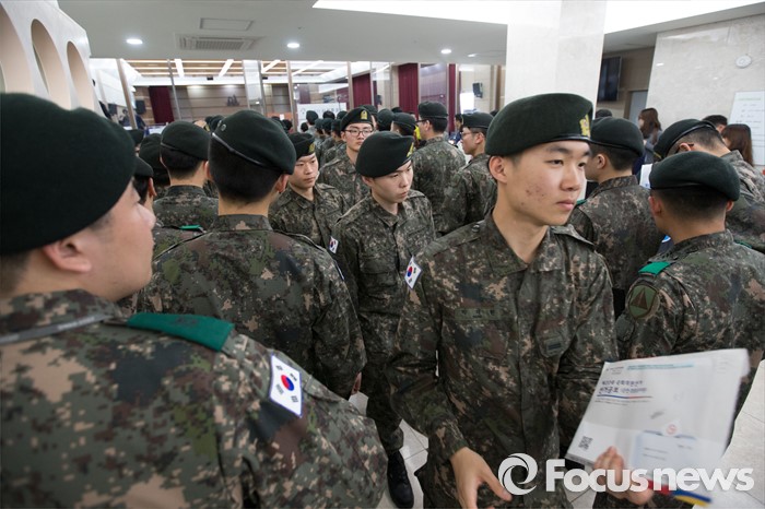 (서울=포커스뉴스) 4.13총선 사전투표 첫째날인 8일 오후 서울 서초구 방배4동 주민센터에 설치된 사전투표소에서 수방사 장병들이 투표를 하기위해 기다리고 있다.