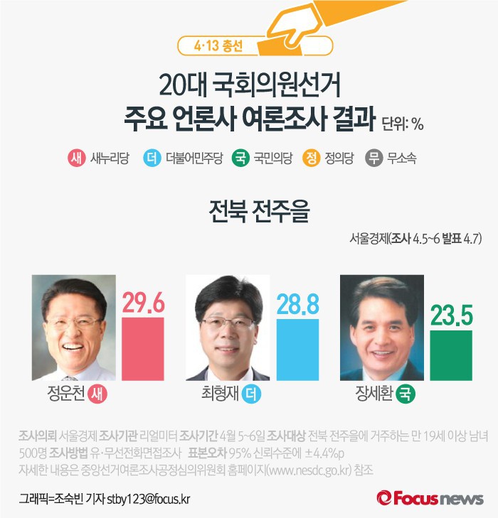 (서울=포커스뉴스) 서울경제가 여론조사기관 리얼미터에 의뢰해 7일 발표한 결과에 따르면 전북 전주을의 지지율은 새누리당 정운천 후보(29.6%), 더민주 최형재 후보(28.8%), 국민의당 장세환 후보(23.5%) 순으로 초접전을 벌이고 있는것으로 나타났다.