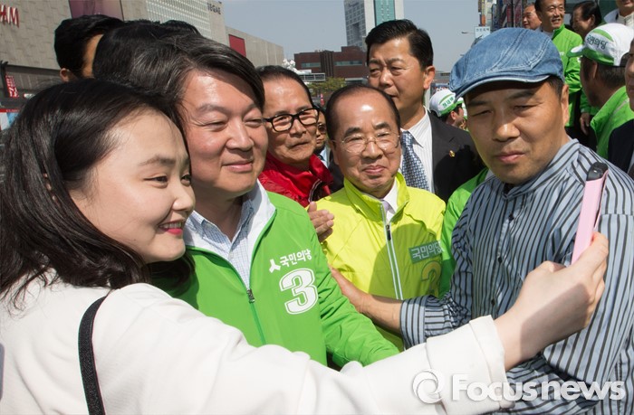 (천안=포커스뉴스) 안철수 국민의당 대표가 8일 오후 충남 천안 신부동 신세계백화점 앞에서 지원유세를 마치고 시민들과 기념사진을 찍고 있다.