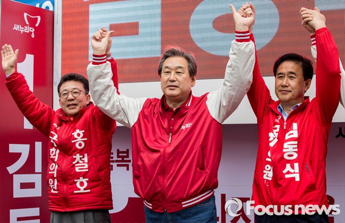 (김포=포커스뉴스) 8일 오후 경기 김포시 사우동 인근에서 김동식 새누리당 김포갑, 홍철호 김포을 후보 합동지원유세에 나선 김무성 대표가 유권자들의 지지를 호소하고 있다.