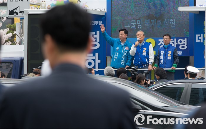 (김포=포커스뉴스) 김종인(가운데) 더불어민주당 비대위 대표 겸 선대위원장이 8일 오후 경기 김포 장기사거리에서 김두관(왼쪽) 김포시갑 후보와 정하영(오른쪽) 김포시을 후보 합동지원유세를 하고 있다.