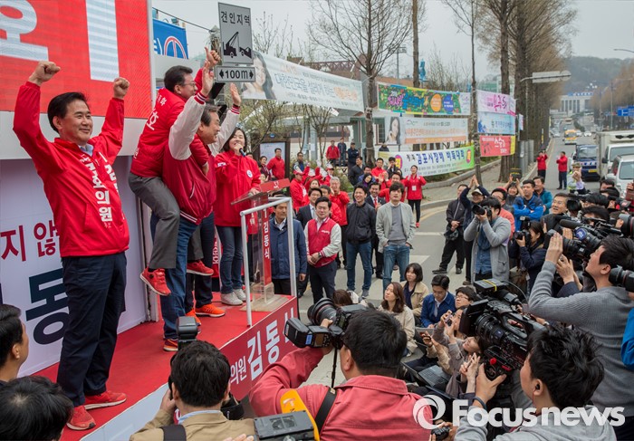 (김포=포커스뉴스) 8일 오후 경기 김포시 사우동 인근에서 김동식 새누리당 김포갑, 홍철호 김포을 후보 합동지원유세에 나선 김무성 대표가 홍 후보를 업어주고 있다.