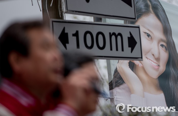 (김포=포커스뉴스) 8일 오후 경기 김포시 사우동 인근에서 김동식 새누리당 김포갑, 홍철호 김포을 후보 합동지원유세에 나선 김무성 대표 뒤로 선거홍보대사 설현의 현수막이 보이고 있다.