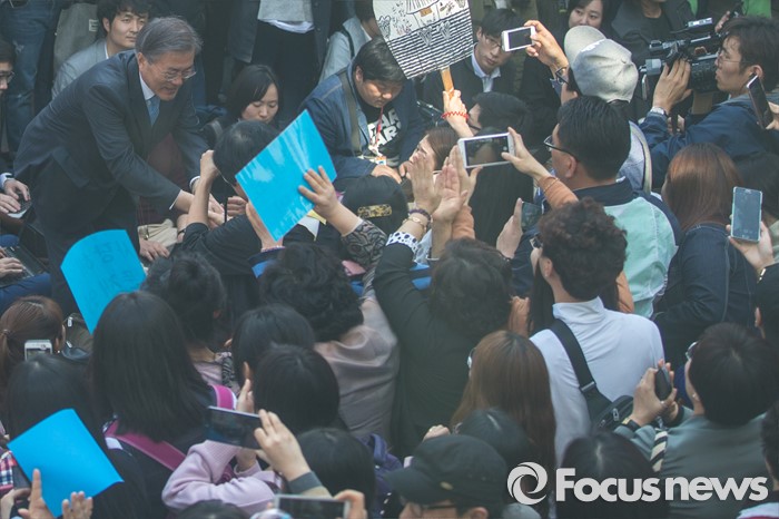 (광주=포커스뉴스) 문재인 더불어민주당 전 대표가 8일 오후 광주광역시 동구 충장로에서 기자회견을 열고 '광주시민께 드리는 글'을 발표하기 위해 연단으로 향하며 지지자들과 악수 하고 있다.