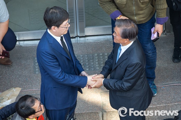 (광주=포커스뉴스) 김홍걸 국민통합위원장이 8일 오후 광주광역시 동구 충장로에서 시민들에게 "문재인 전 대표 아버지(故 김대중 전 대통령) 배신하지않았다"는 입장을 밝힌 뒤 문 전 대표와 악수 하고 있다.