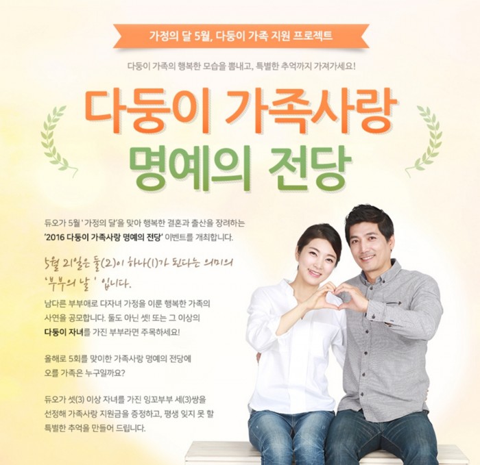 이번 주제는 '행복한 다둥이 가족'으로, 다양한 가족 사진과 사연을 받는다. 다자녀 가족의 행복을 공유하고 싶은 사람이라면 누구나 듀오 홈페이지를 통해 응모할 수 있다.