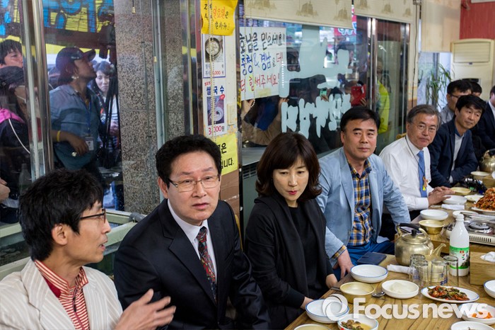 문 전 대표는 "운동권 세력에 적대적이고 호남 홀대가 사실이라면 우리가 영남에서 환영을 받아야 하는데 영남에선 화형식을 하고 노무현과 문재인이 호남을 더 챙긴다고 한다"며 "이런 것이 다 프레임"이라면서 '친노 패권' 지적에 적극 해명했다.(광주=포커스뉴스) 문재인 더불어민주당 전 대표가 8일 오후 광주광역시 광산구 월곡시장 인근 막걸리집에서 지역 4050 주민들과 간담회를 하고 있다. 2016.04.08 강진형 기자