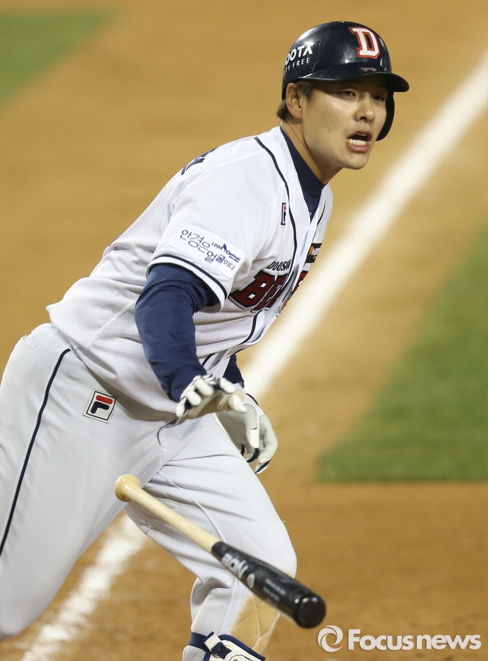 (서울=포커스뉴스) 8일 서울 잠실구장에서 열린 2016 프로야구 넥센-두산 경기 8회말 2사 만루에서 두산 민병헌이 볼넷으로 타점을 올리며 1루로 뛰어 나가고 있다.