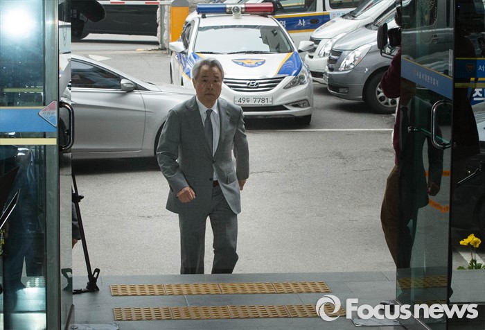 (서울=포커스뉴스) 정우현 MPK그룹 회장이 경찰 조사를 받기 위해 9일 오전 서울 서대문경찰서에 출석하고 있다. '미스터피자'를 운영하는 MPK 그룹의 정 회장은 지난 2일 서대문구의 한 건물 경비원 황모(58)씨의 뺨을 때린 혐의를 받고 있다.
