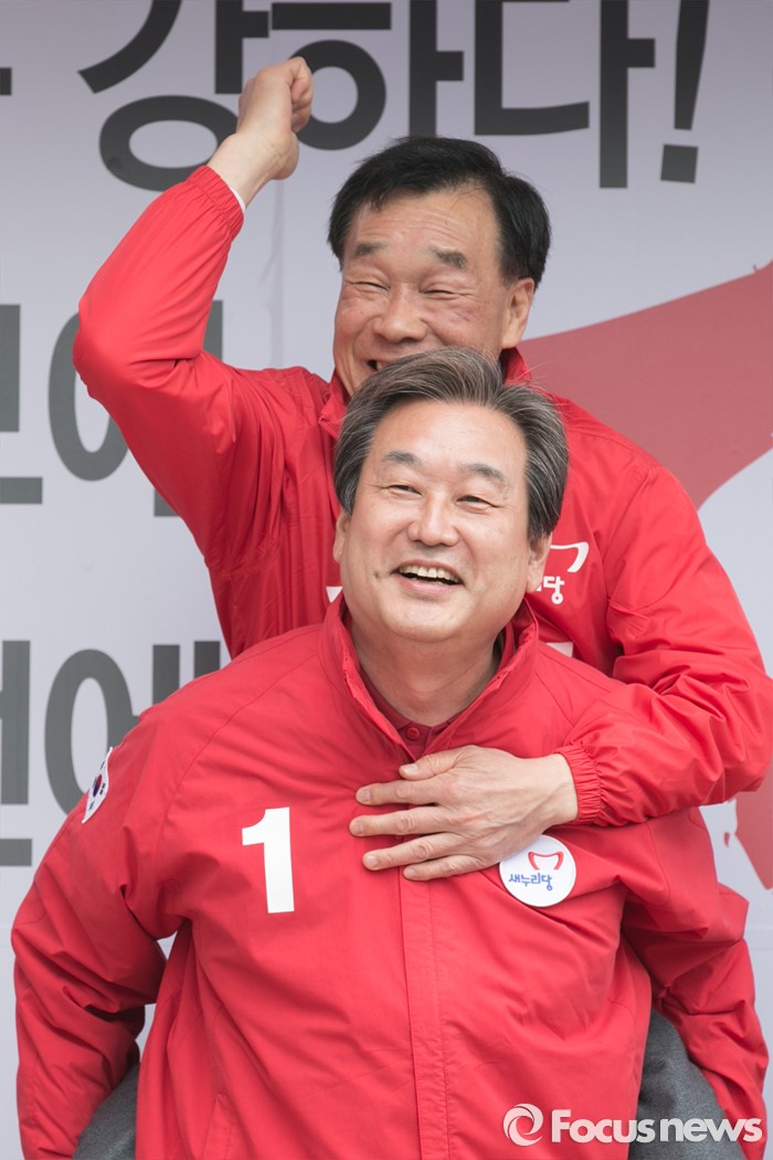(원주=포커스뉴스) 제20대 국회의원 선거를 나흘 앞둔 9일 오전 강원도 원주시 치악로 남부시장 앞에서 김무성(앞) 새누리당 대표가 김기선(뒤) 원주갑, 이강후 원주을 후보 지원유세에 참석해, 김 후보를 업고 있다.