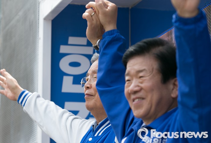 (대전=포커스뉴스) 9일 오후 대전 서구 도마네거리에서 김종인(왼쪽) 더불어민주당 비대위 대표 겸 선대위원장과 박병석 대전서구갑 후보가 선거유세를 하며 지지를 호소하고 있다.