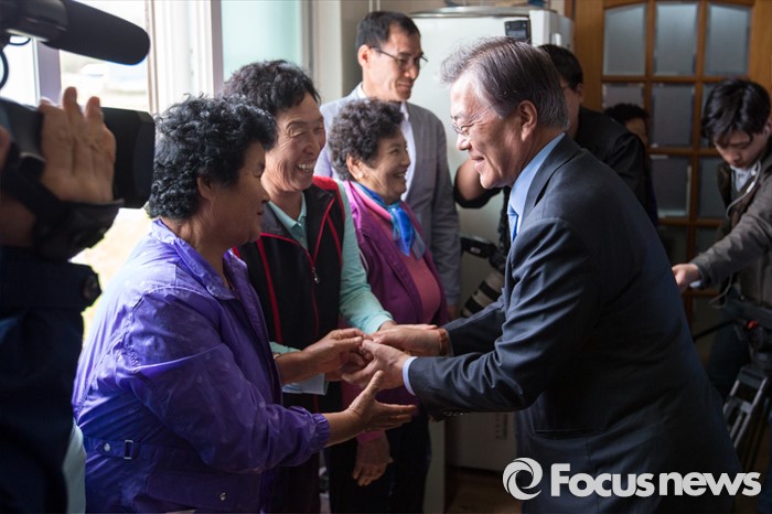 (광주=포커스뉴스) 문재인 더불어민주당 전 대표가 9일 오전 광주광역시 서구 발산마을회관을 방문해 어르신들과 인사 하고 있다.