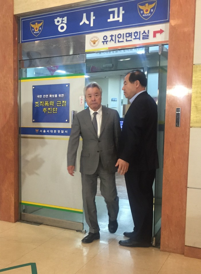 (서울=포커스뉴스) 경비원 폭행 혐의로 불구속 입건된 정우현(68) MPK 그룹 회장이 9일 서울 서대문경찰서에서 약 3시간 동안 경찰조사를 받고 귀가했다.
