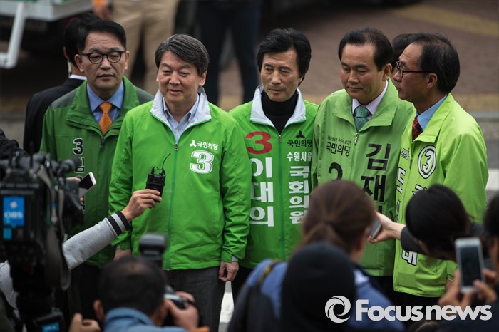 (수원=포커스뉴스) 9일 오후 수원시 장안구 수원종합운동장에서 열린 국민의당 합동유세에 참석한 안철수 대표가 취재진의 질문에 답변하고 있다.
