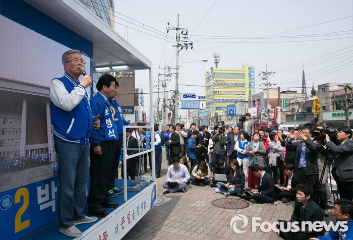 (대전=포커스뉴스) 9일 오후 대전 서구 도마네거리에서 김종인(왼쪽) 더불어민주당 비대위 대표 겸 선대위원장이 박병석 대전서구갑 후보의 지원유세 중 지지를 호소하고 있다.