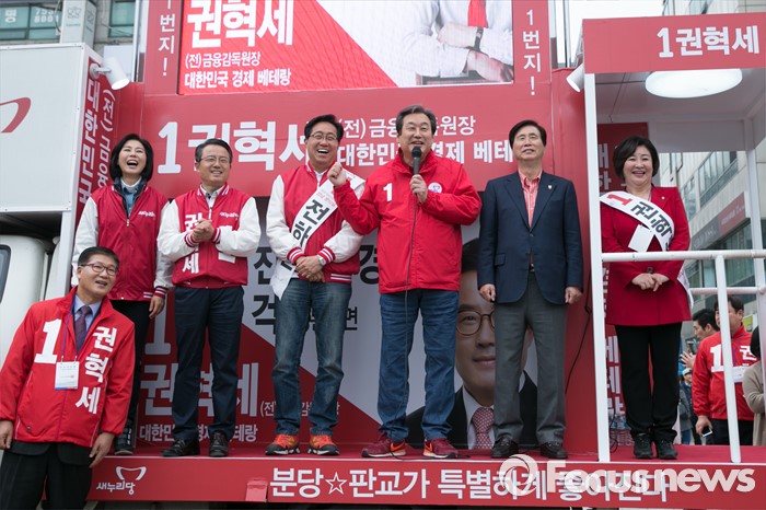 (성남=포커스뉴스) 제20대 국회의원 선거를 나흘 앞둔 9일 오후 성남시 분당구 야탑역 광장에서 김무성(오른쪽 세번째) 새누리당 대표가 권혁세(왼쪽 세번째) 분당갑, 전하진(왼쪽 네번째) 분당을 후보 지원유세를 하고 있다.