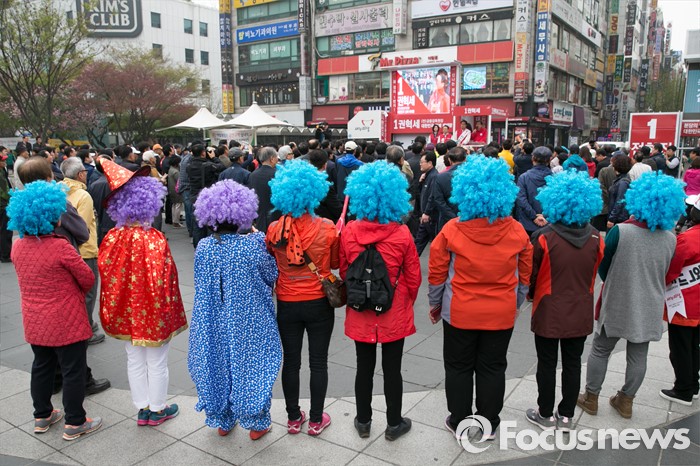 (성남=포커스뉴스) 제20대 국회의원 선거를 나흘 앞둔 9일 오후 성남시 분당구 야탑역 광장에서 새누리당 선거운동원들이 김무성 대표의 연설을 듣고 있다.
