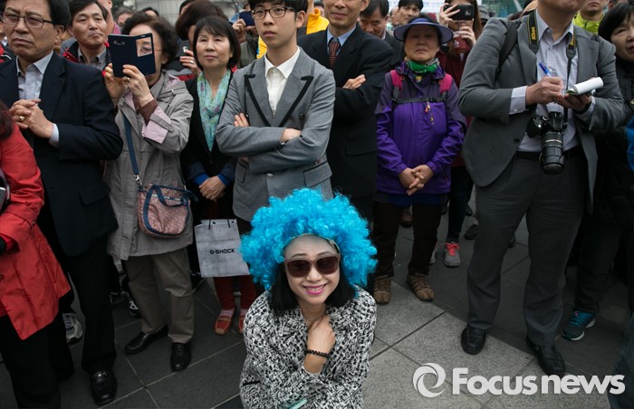 (성남=포커스뉴스) 제20대 국회의원 선거를 나흘 앞둔 9일 오후 성남시 분당구 야탑역 광장에서 가발을 쓴 한 지지자가 김무성 새누리당 대표의 지원유세를 보며 웃고 있다.