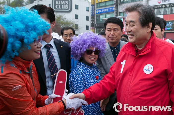 (성남=포커스뉴스) 제20대 국회의원 선거를 나흘 앞둔 9일 오후 성남시 분당구 야탑역 광장에서 김무성(오른쪽) 새누리당 대표가 권혁세 분당갑, 전하진 분당을 후보 지원유세를 마친 뒤, 선거운동원과 악수하고 있다.