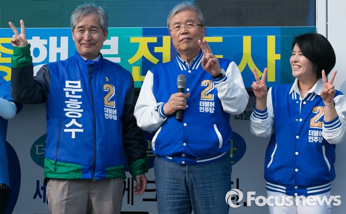 (세종=포커스뉴스) 9일 오후 세종시 국립세종도서관 앞에서 김종인(가운데) 더불어민주당 비대위 대표 겸 선대위원장과 문흥수(왼쪽) 세종시 후보, 허윤정 비례대표 후보가 선거유세를 하고 있다.