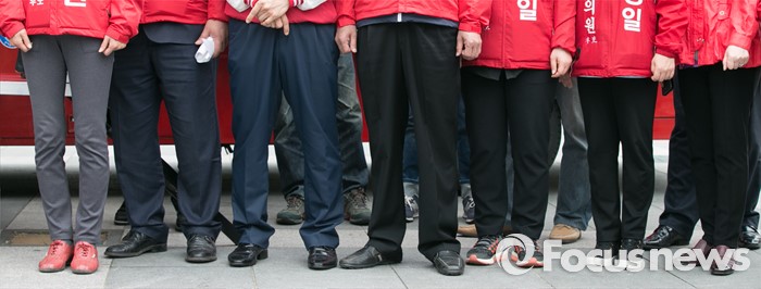 (용인=포커스뉴스) 제20대 국회의원 선거를 나흘 앞둔 9일 오후 경기도 용인시 기흥구 죽현마을 중앙공원에서 새누리당 선거운동원들이 나란히 서 있다.