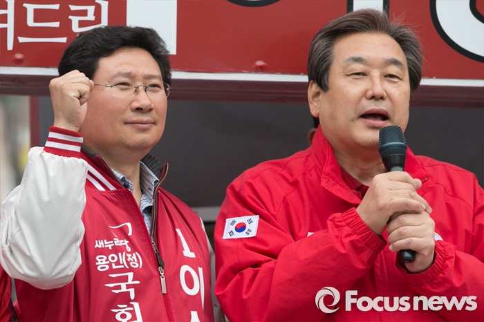 (용인=포커스뉴스) 제20대 국회의원 선거를 나흘 앞둔 9일 오후 경기도 용인시 기흥구 죽현마을 중앙공원에서 김무성(오른쪽) 새누리당 대표가 이상일(왼쪽) 용인정, 허명환 용인을 후보 지원유세를 하고 있다.