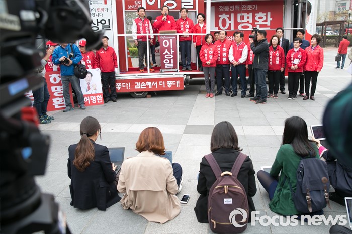 (용인=포커스뉴스) 제20대 국회의원 선거를 나흘 앞둔 9일 오후 경기도 용인시 기흥구 죽현마을 중앙공원에서 김무성 새누리당 대표가 이상일 용인정, 허명환 용인을 후보 지원유세를 하고 있다.