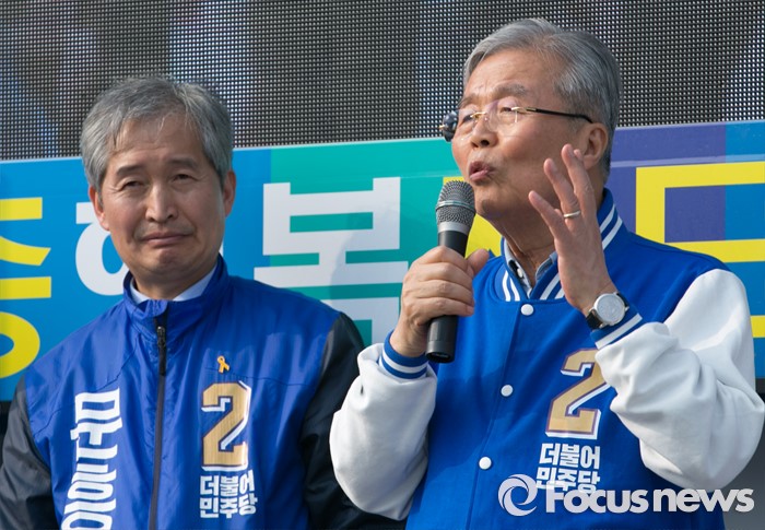 (세종=포커스뉴스) 9일 오후 세종시 국립세종도서관 앞에서 김종인(오른쪽) 더불어민주당 비대위 대표 겸 선대위원장이 문흥수 세종시 후보의 지지를 호소하고 있다.
