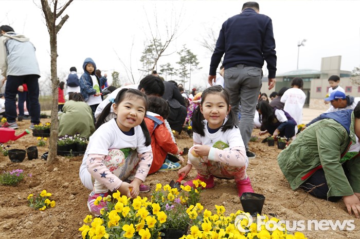(서울=포커스뉴스) 9일 경기도 양주시 장흥문화예술회관에서 열린 '대한아토피협회와 함께하는 꽃나무 심는 날'에 참가한 어린이들이 꽃나무를 심고 있다. 이번 행사는 경기도 양주시 시설관리공단의 협조와 대유위니아, CJ제일제당, 에이치에스디, 에이플트리, 드올앤컴퍼니 등 기업들의 후원으로 진행됐으며, 정슬기의 마술쇼, 쿠키토이 티나(김민희 아나운서)의 재능기부도 이어졌다. <사진제공=대한아토피협회>
