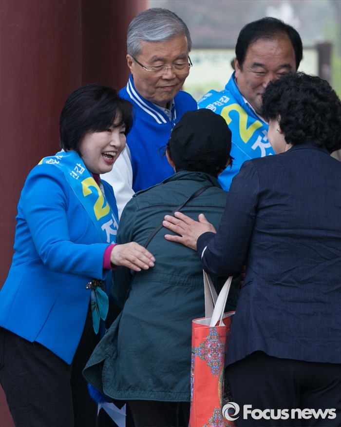 (서울=포커스뉴스) 김종인 더불어민주당 비대위 대표 겸 선대위원장과 전혜숙 광진갑 후보가 10일 오전 서울 어린이대공원 앞에서 나들이객들에게 인사하며 지지를 호소하고 있다.