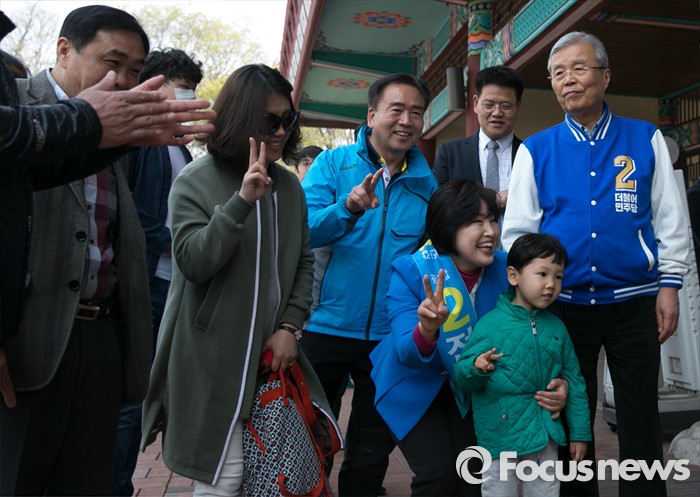 (서울=포커스뉴스) 김종인 더불어민주당 비대위 대표 겸 선대위원장과 전혜숙 광진갑 후보가 10일 오전 서울 어린이대공원 앞에서 나들이객들과 기념촬영을 하고 있다.