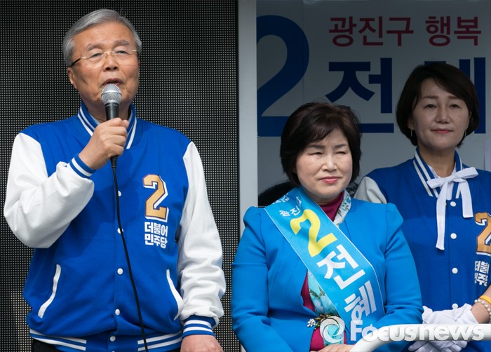 (서울=포커스뉴스) 김종인 더불어민주당 비대위 대표 겸 선대위원장과 전혜숙 광진갑 후보가 10일 오전 서울 어린이대공원 앞에서 선거유세를 하며 지지를 호소하고 있다.