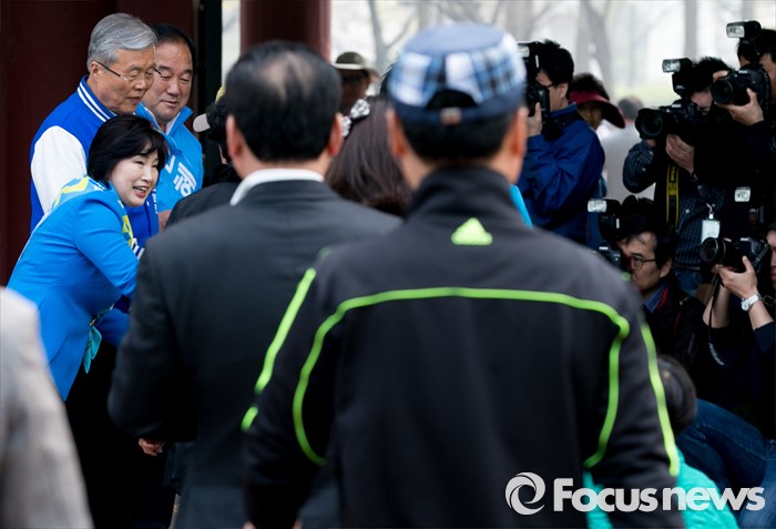 (서울=포커스뉴스) 김종인 더불어민주당 비대위 대표 겸 선대위원장과 전혜숙 광진갑 후보가 10일 오전 서울 어린이대공원 앞에서 나들이객들에게 인사하며 지지를 호소하고 있다.