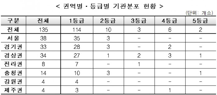 4차 평가결과 1등급기관은 114개소(84.5%)로 1차 평가 대비 70개소 증가, 5등급기관은 2개소로 1차 평가 대비 6개소 감소했다.<자료출처=건강보험심사평가원>