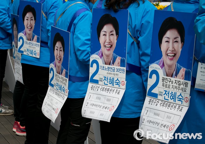 (서울=포커스뉴스) 10일 오전 서울 어린이대공원 앞에서 전혜숙 더불민주당 광진갑 후보의 선거운동원들이 지지를 호소하고 있다.