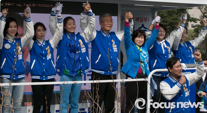 | △ 손 들어 지지 호소하는 더민주 |