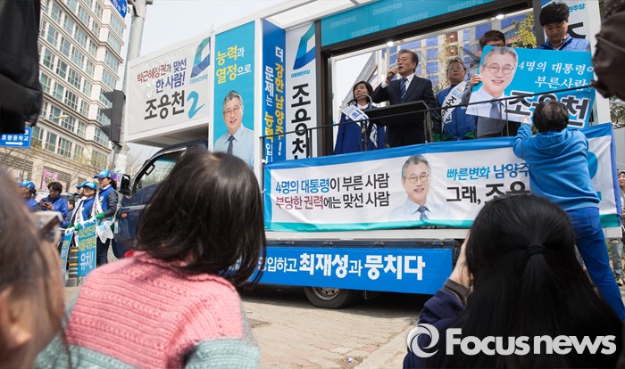 (남양주=포커스뉴스) 문재인 더불어민주당 전 대표가 10일 오전 경기도 이마트 남양주점 인근에서 조응천 더불어민주당 남양주갑 후보, 최민희 더불어민주당 남양주병 후보와 함께 유권자들에게 지지를 호소하고 있다.
