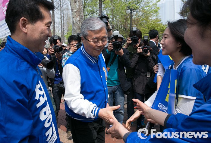 (서울=포커스뉴스) 김종인(가운데) 더불어민주당 비대위 대표 겸 선대위원장이 10일 오전 서울 석촌호수 서호 인근 거리에서 지원유세를 마친 뒤 최명길(왼쪽) 송파을 후보의 가족들과 인사하고 있다.