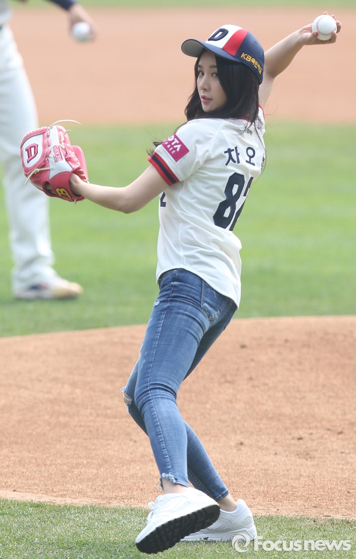 (서울=포커스뉴스) 10일 서울 잠실구장에서 열린 2016 프로야구 넥센-두산 경기에서 걸그룹 피에스타의 차오루가 시구하고 있다.