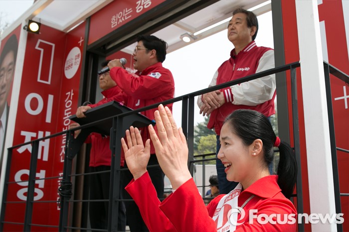 (서울=포커스뉴스) 10일 오전 서울 강동구 양재대로 둔촌시장 앞에서 방송인 박정숙(앞) 씨가 남편 이재영 새누리당 강동을 후보 유세를 보며 박수치고 있다.