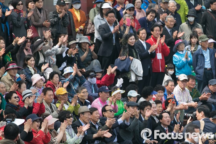 (서울=포커스뉴스) 10일 오전 서울 송파구 성내천 물빛광장에서 시민들이 김을동 새누리당 송파병 후보 유세를 보고 있다.